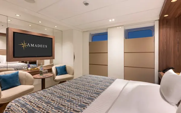 These staterooms feature the AMADEUS Signature Bed (available as a double or twin), a drop-down panoramic window for uninterrupted river views, a spacious bathroom with a walk-in shower and premium Rituals® bathing products, walk-in wardrobe, flat-screen TV, individual climate control, well-stocked minibar, in-room safe, hair dryer, and direct dial telephone — ensuring a comfortable and refined travel experience.