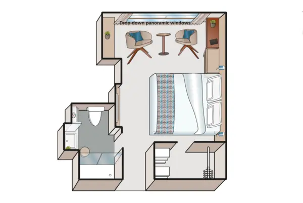 Each cabin features a spacious bathroom with a walk-in shower, luxurious Rituals bath products, and a hair dryer, along with a fixed panoramic window that fills the space with natural light. Thoughtful touches like a comfortable double or twin bed, generously-sized wardrobe, secure in-room safe, flat-screen TV, individual climate control, well-stocked minibar and direct dial telephone ensure a restful and well-equipped stay.