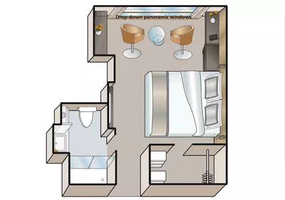 Each cabin features a spacious bathroom with a walk-in shower, luxurious Rituals bath products, and a hair dryer, along with a fixed panoramic window that fills the space with natural light. Thoughtful touches like a comfortable double or twin bed, generously-sized wardrobe, secure in-room safe, flat-screen TV, individual climate control, and direct dial telephone ensure a restful and well-equipped stay.