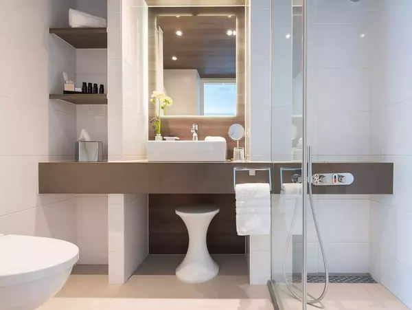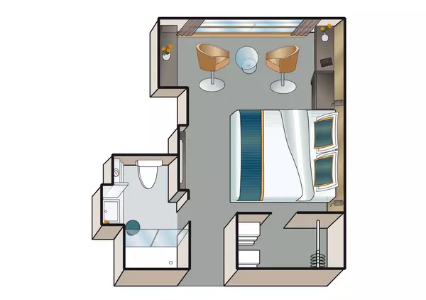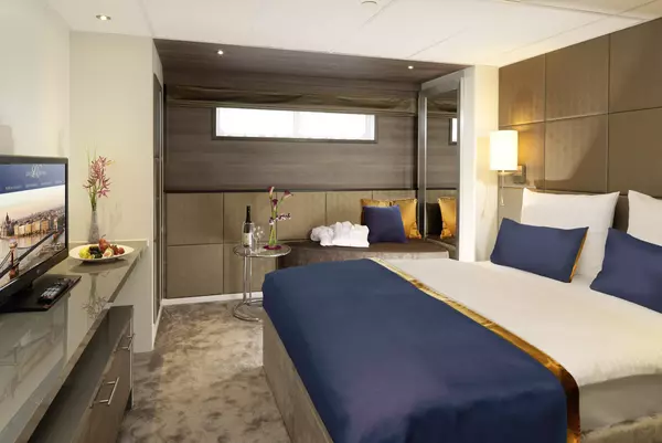 Each cabin features a spacious bathroom with a walk-in shower, luxurious Rituals bath products, and a hair dryer, along with a fixed panoramic window that fills the space with natural light. Thoughtful touches like a comfortable double or twin bed, generously-sized wardrobe, secure in-room safe, flat-screen TV, individual climate control and direct dial telephone ensure a restful and well-equipped stay.