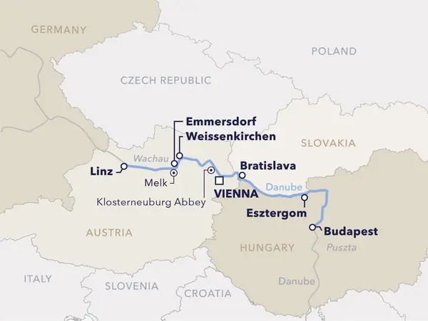 Enjoy a relaxing morning on board as your ship sails upriver. After lunch, the Slovakian capital Bratislava comes into view. Although relatively small, the city impresses with its charm and diversity. On the guided excursion, pass by St. Martin’s Cathedral and the elegant Grassalkovich Palace, then ascend to the Bratislava Castle. From the viewing terrace, enjoy breathtaking views over the city, countryside, and the Danube.