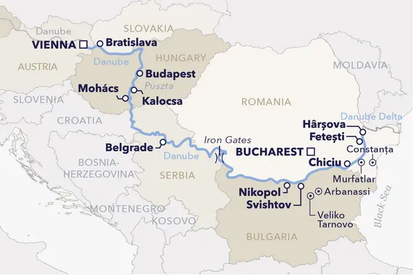 Your adventure begins in vibrant Bucharest, where the rhythm of the city invites you to dive into its lively streets and rich culture. From here, you transfer overland to your floating hotel, which will carry you through Belgrade, Bratislava, and Budapest, all the way to Vienna. Be amazed by the dramatic passage of the Iron Gates in the wild Carpathians, Europe’s spectacular river gorge, where sheer cliffs and rushing waters showcase nature’s power and beauty. In the UNESCO-listed Danube Delta, a guided boat excursion brings you face-to-face with a rare and vibrant ecosystem, making memories that last a lifetime.