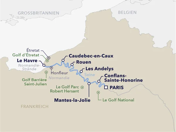 Verbinden Sie die Liebe zum Reisen mit Ihrer Leidenschaft für Golf – auf unserer ebenso spannenden wie entspannten Golfkreuzfahrt von Paris bis in die Normandie und zurück. Dabei holen Sie kulturell und sportlich weit aus und entdecken neben den Prachtstädten entlang der Seine einige der besten Golfplätze weltweit. Immer an Ihrer Seite: ein erfahrener Golfexperte, der Ihnen mit seinem Know-how die Bälle zuspielt. Dazu spielen für Sie die wildromantischen Naturschönheiten Nordfrankreichs groß auf. Holt Ihre Reiselust bereits Schwung? Dann starten Sie mit uns zu dieser 8-tägigen Golftraumreise.