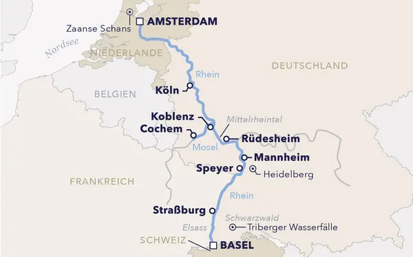 Erleben Sie 8 faszinierende Tage auf dem Rhein – von der Dreiländerecke bei Basel entlang malerischer Elsass-Orte, durch das sagenhafte Mittelrheintal bis zu den Grachten Amsterdams. Bewundern Sie die historischen Altstädte von Straßburg, Koblenz und Köln, genießen Sie die Weinlandschaften der Mosel und die imposanten Burgen am Fluss, und lassen Sie sich von den charmanten Städten Rüdesheim, Speyer und Heidelberg verzaubern.