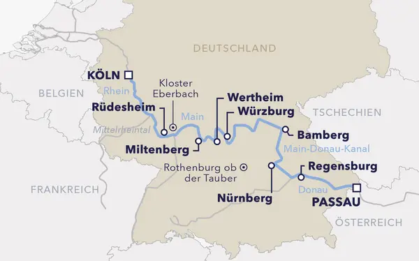 Erleben Sie acht Tage voller Vielfalt und Romantik entlang von Rhein, Main und Donau. Staunen Sie über das UNESCO-geschützte Obere Mittelrheintal mit seinen Burgen und dem sagenhaften Loreleyfelsen, genießen Sie die idyllischen Mainstädte Miltenberg und Wertheim sowie die barocke Pracht Würzburgs. Bamberg erzählt seine tausendjährige Geschichte, während die Passage des Main-Donau-Kanals ein beeindruckendes Ingenieurswunder offenbart. Nürnberg und Regensburg vereinen mittelalterlichen Charme mit lebendiger Gegenwart, regionale Köstlichkeiten und stimmungsvolle Abende an Bord runden Ihre Reise ab.