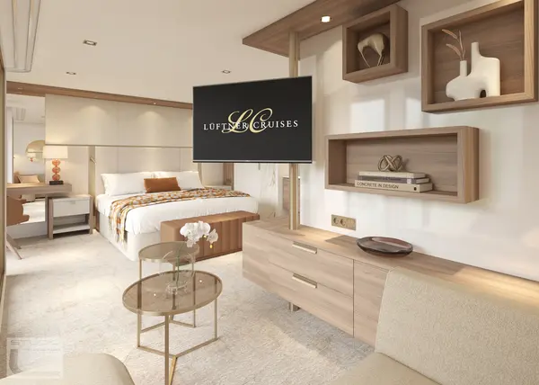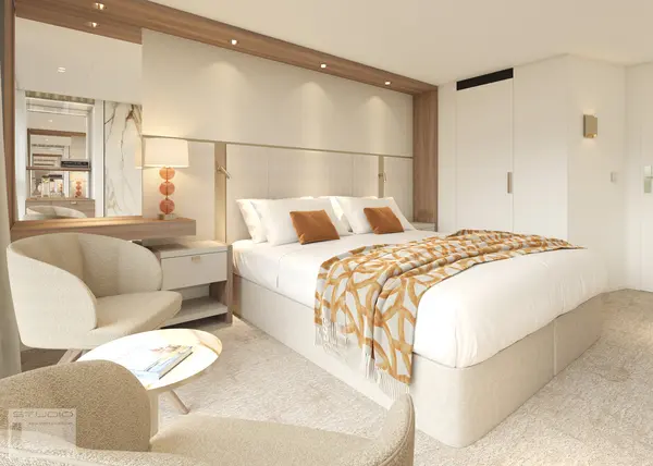 Gemütliche Sitzecke, luxuriöses Badezimmer, begehbarer Außenbalkon, Minibar, begehbarer Kleiderschrank, wahlweise Doppelbett oder zwei Einzelbetten, Flachbildschirm-TV, individuell regulierbare Klimaanlage, Dusche/WC, Bademantel, Haartrockner, Telefon und Safe.