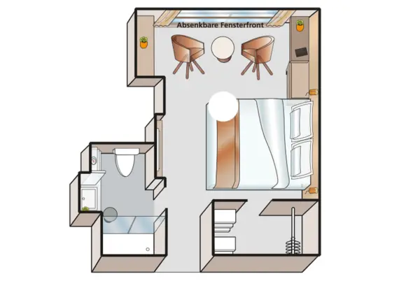 Großzügiges Badezimmer, absenkbare Panorama-Fensterfront, Minibar, begehbarer Kleiderschrank, wahlweise Doppelbett oder zwei Einzelbetten, Flachbildschirm-TV, individuell regulierbare Klimaanlage, Dusche/WC, Haartrockner, Telefon und Safe.