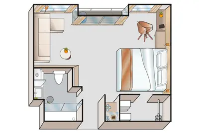 Großzügiges Badezimmer, Aussichtsfenster (Öffnen nicht möglich), begehbarer Kleiderschrank, wahlweise Doppelbett oder zwei Einzelbetten, Flachbildschirm-TV, individuell regulierbare Klimaanlage, Dusche/WC, Haartrockner, Telefon und Safe.