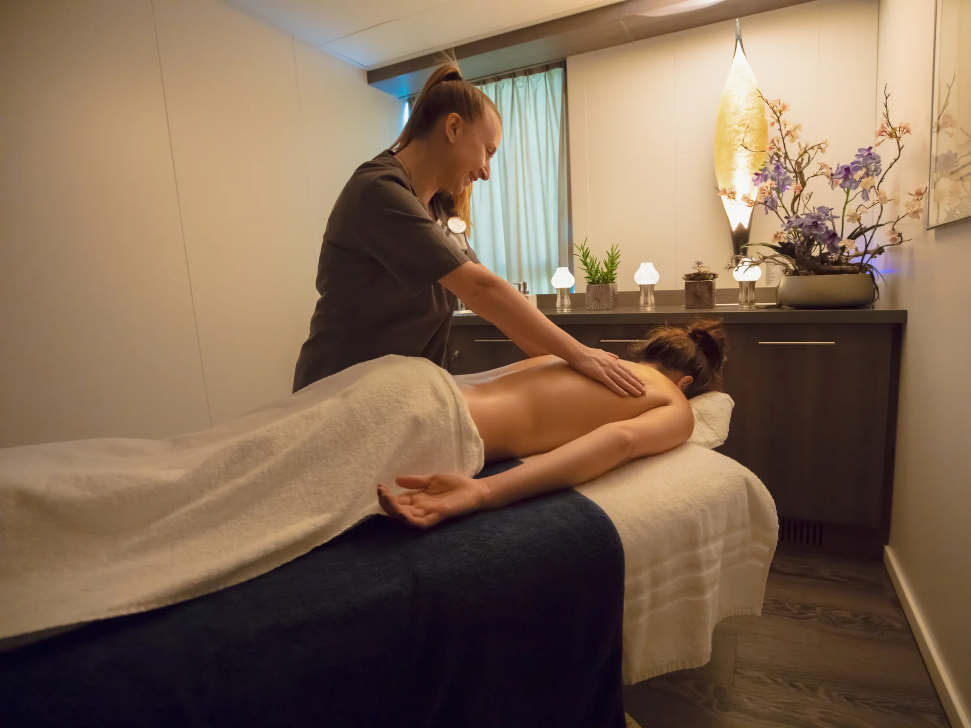 Großzügiges Badezimmer, Aussichtsfenster (Öffnen nicht möglich), begehbarer Kleiderschrank, wahlweise Doppelbett oder zwei Einzelbetten, Flachbildschirm-TV, individuell regulierbare Klimaanlage, Dusche/WC, Haartrockner, Telefon und Safe. Kabinen mit Verbindungstüren sind auf Anfrage verfügbar.