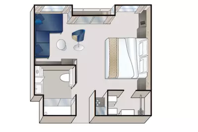 Großzügiges Badezimmer, absenkbare Panorama-Fensterfront, Minibar, begehbarer Kleiderschrank, wahlweise Doppelbett oder zwei Einzelbetten, Flachbildschirm-TV, individuell regulierbare Klimaanlage, Dusche/WC, Haartrockner, Telefon und Safe. Kabinen mit Verbindungstüren sind auf Anfrage verfügbar.