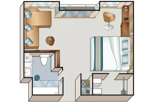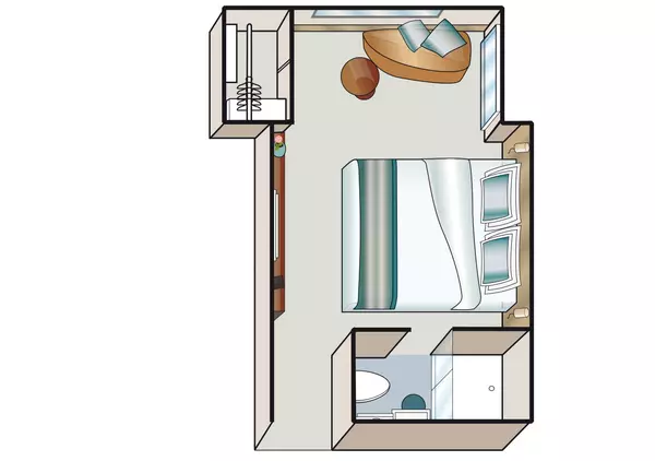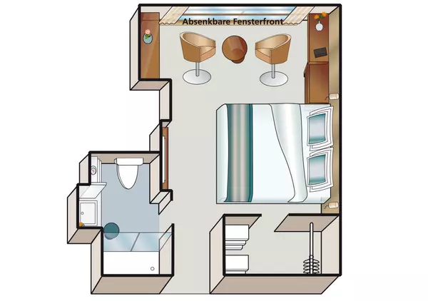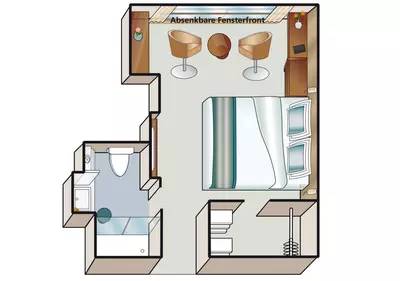 Großzügiges Badezimmer, Aussichtsfenster (Öffnen nicht möglich), begehbarer Kleiderschrank, wahlweise Doppelbett oder zwei Einzelbetten, Flachbildschirm-TV, individuell regulierbare Klimaanlage, Dusche/WC, Haartrockner, Telefon und Safe. Kabinen mit Verbindungstüren sind auf Anfrage verfügbar.